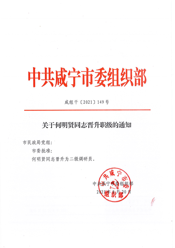 名       称: 关于何明贤同志晋升职级的通知 发布日期: 2021年10月20日