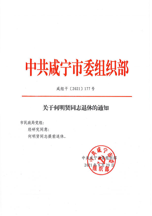 名       称: 关于何明贤同志退休的通知 发布日期: 2021年10月20日