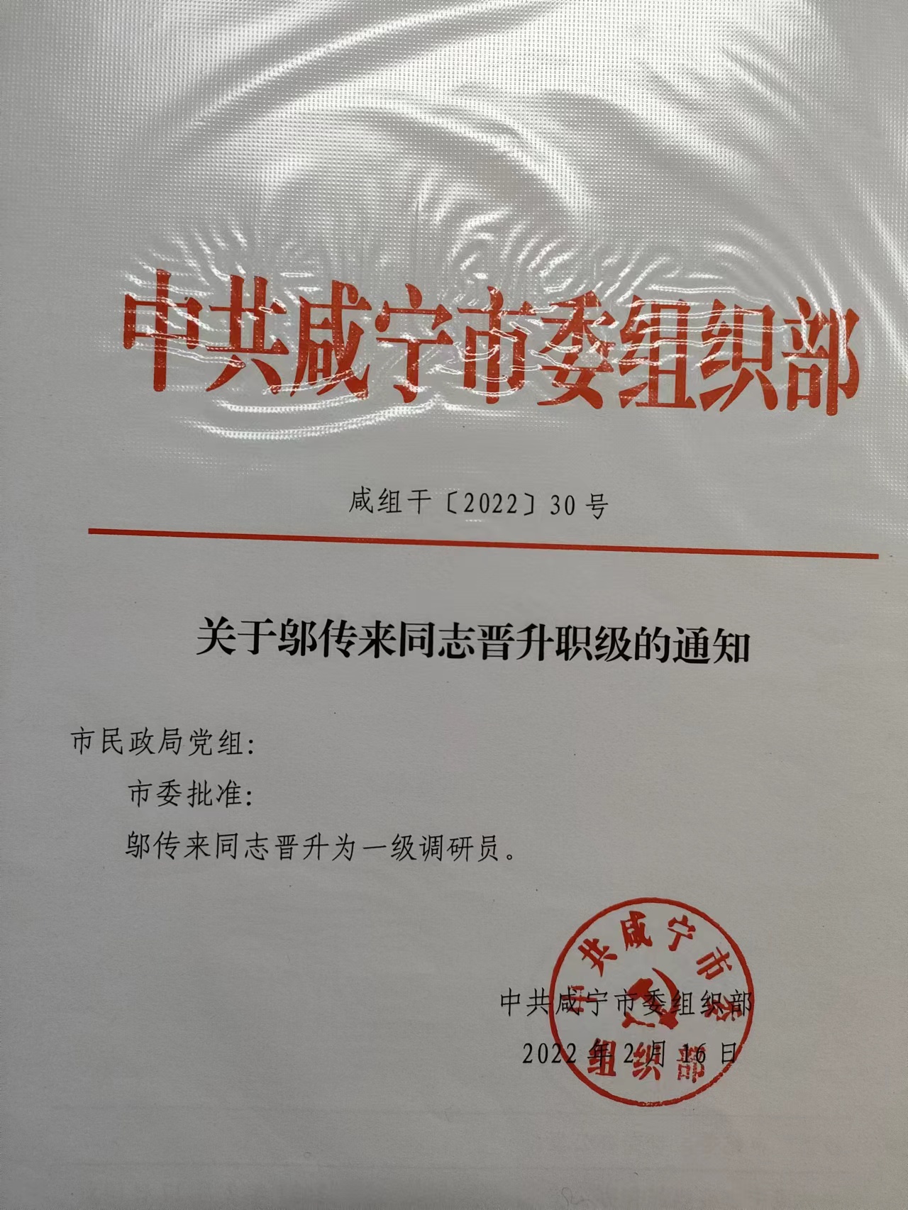 名       称: 关于邬传来同志职级晋升的通知 发布日期: 2022年05月16日